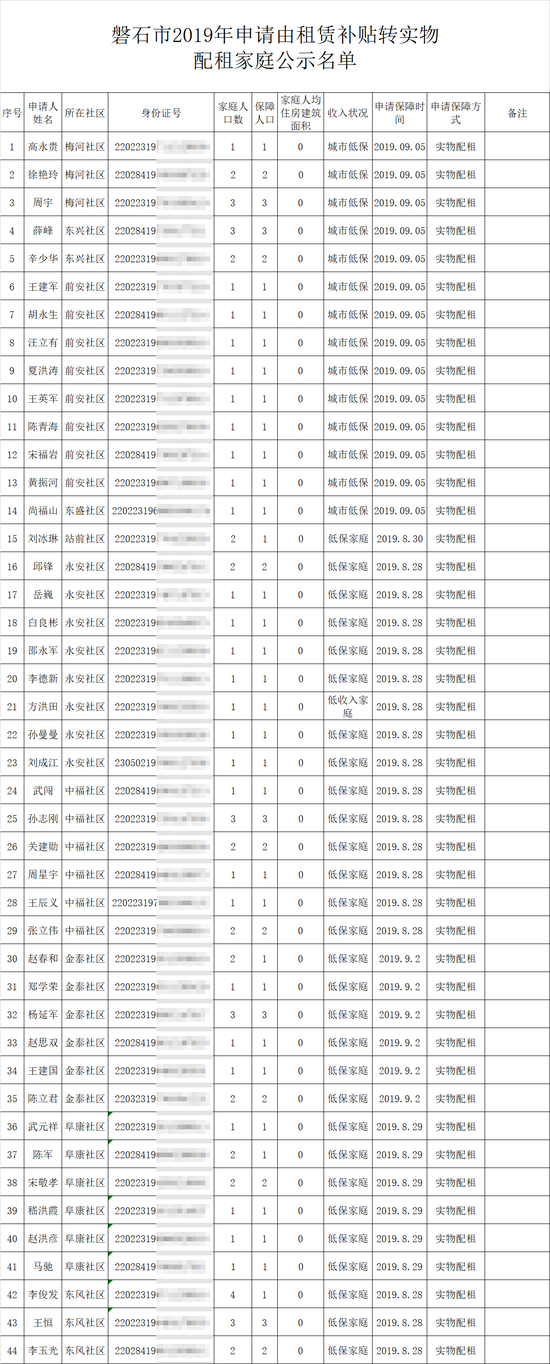 《关于磐石市2019年申请由租赁补贴转实物配租的家庭名单公示的通知》其中附有一份名单澎湃新闻注意到,该公示附件中的名单将44条相应人员的姓名、身份证号码、家庭人口数完整公示出来,对身份证号码未做任何模糊处理,且公示期早已过去,但截至记者检索时,相应信息仍在网上对外公布。
