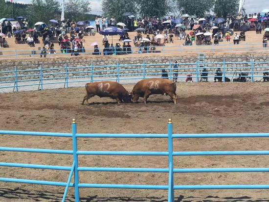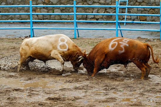 经过了两天的比赛,在17日的决赛中,精彩的场景让观众热情高涨,斗牛场立即热闹起来。参加比赛的斗牛有的昂首挺胸,迈着粗壮的腿脚,毫不畏惧地跟随主人走进赛场,不等裁判哨响,便低头向对手冲去,两只庞然大物头角相撞,砰砰作响。一时间,场内尘土飞扬,精彩无比!