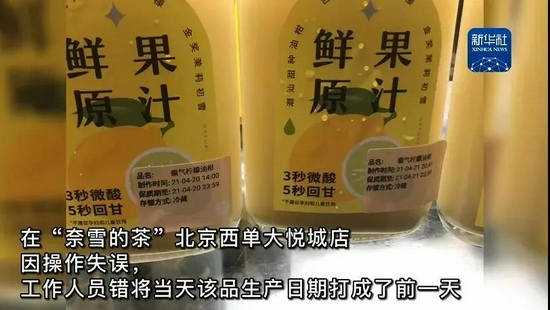 奈雪饮品“霸气柠檬油柑”保质期只有一天。但在“奈雪的茶”北京西单大悦城店,生产标签为手工输入。因操作失误,出现过工作人员错将当天该品生产日期打成前一天的情况。直到晚上闭店时,店长才发现。工作人员在群中私下处理了此事,相关情况并未对消费者公示,也未采取任何补救措施。
