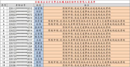 为使广大机动车驾驶人受到警示教育,清醒认识交通事故肇事逃逸的严重后果,提高遵守交通法律法规的自觉性,吉林省公安厅交警总队公布了因醉酒驾驶机动车和交通肇事逃逸被追究刑事责任被终生禁驾的19名人员情况。