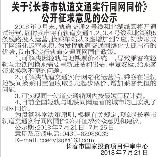 21日,长春市国家投资项目评审中心发布一则关于《长春市轨道交通实行同网同价》公开征求意见的公示。