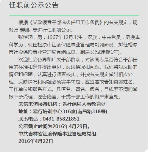 张博翔,男,1967年12月出生,汉族,中共党员,函授本科学历,现任松原市社会保险事业管理局副调研员。拟任松原市社会保险事业管理局党组成员、副局长(试用期1年)。