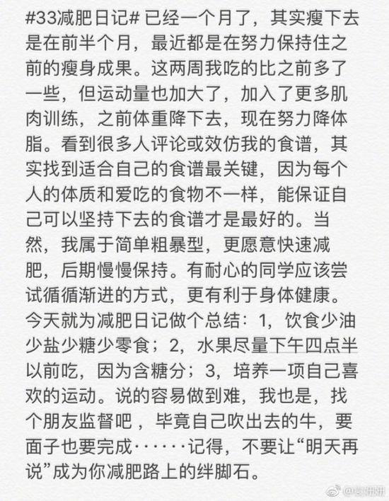 新浪娱乐讯 3月19日晚,袁姗姗晒倒立照,并分享33天减肥法,称:“管住嘴…迈开腿…倒立想想这一个月为何这么苦。”微博中还称,这段时间减肥除了控制饮食,大量的运动是必不可少的,并劝诫网友要找到适合自己的饮食、培养一项喜欢的运动,有耐心的尝试循序渐进的方法。