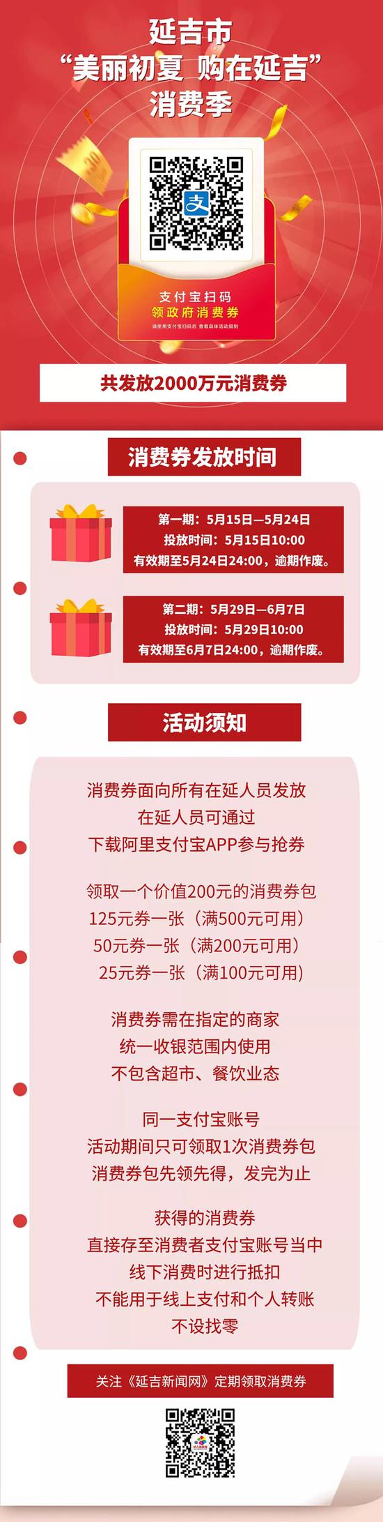 5月15日起,延吉市政府将通过支付宝分两期派发2000万元消费券,所有在延人员届时均可通过下载阿里支付宝APP参与抢券。