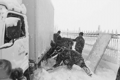 货车被困半米厚积雪中 边防官兵连挖带推救援