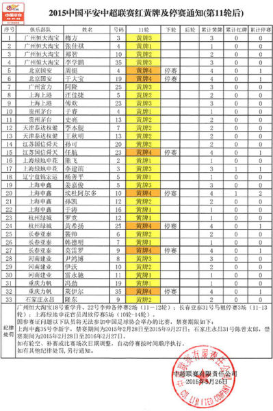 新浪体育讯  本周末,2015中超联赛第12轮将全面打响。就在今天(5月26日),中国足协公布了上轮联赛结束后各队红黄牌及停赛通知。其中,有7名球员会在本轮中超联赛中停赛。他们分别是:北京国安队的于大宝和周挺;江苏舜天队的任航;上海申鑫队的埃杜阿尔多;杭州绿城队的黄希扬;长春亚泰队的莫雷罗以及重庆力帆队的莱伊尔。