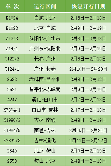 节后返程高峰来临,为满足旅客出行需要,沈阳局集团公司,调整优化列车开行方案。41趟停运列车将恢复开行,其中涉及吉林省的有19趟。快来看看都有哪些车次。