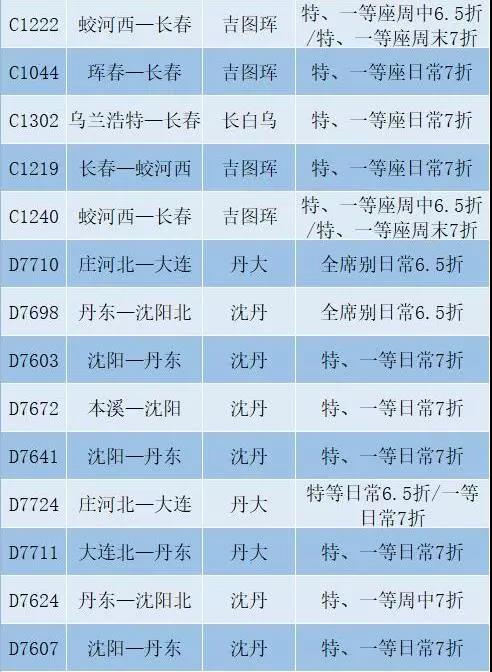 今年以来,中国铁路沈阳局集团有限公司根据客运市场规律和旅客实际需求,从降低旅客出行成本的角度出发,在沈丹、丹大、京沈、新通、长白乌、吉珲等线路上,按照执行票价的6.5—7折不等实行票价优惠,目前仍有29趟动车组列车实行票价打折。