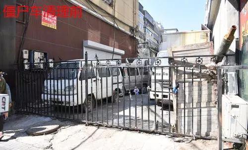 而在马路对面,同样是两栋楼中间的消防通道上,则停放着许多“僵尸车”。这些车辆以面包车居多,都没有牌照,已经破损到无法开动。
