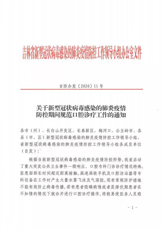 1月30日,吉林省新型冠状病毒感染的肺炎疫情防控工作领导小组办公室下发了《关于新型冠状病毒感染的肺炎疫情防控期间规范口腔诊疗工作的通知》,通知要求除必要的口腔颌面外科急诊外,全省口腔专科门诊部及诊所全面停诊。