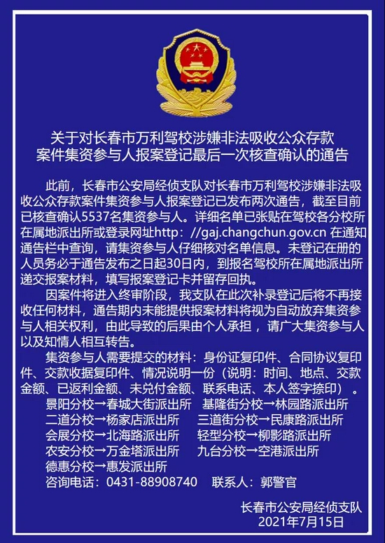 此前,长春市公安局经侦支队对长春市万利驾校涉嫌非法吸收公众存款案件集资参与人报案登记已发布两次通告,截至目前已核查确认5537名集资参与人。详细名单已张贴在驾校各分校所在属地派出所或登录网址http: //gaj.changchun.gov.cn 在通知通告栏中查询,请集资参与人仔细核对名单信息。未登记在册的人员务必于通告发布之日起30日内,到报名驾校所在属地派出所递交报案材料,填写报案登记卡并留存回执。