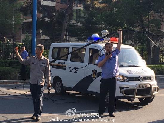 长春一处电线杆倒落 交警托举电线保持路面畅通
