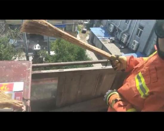 经过侦查,消防员发现,阳台门板后和杂物下面有一个蝙蝠窝,里面有近十只蝙蝠。阳台的空间本来就小,又堆放了很多杂物,这给救援带来一定困难。消防员挪开了门板,先是利用扫帚,将蝙蝠一只一只扫掉,随后又戴上手套,将蝙蝠逐只捉住放生。