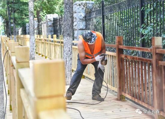 工人们正在小心翼翼地进行防腐漆的喷涂为什么要在这里修一条木栈道呢?记者了解到,这里曾是一条绿化带,树木茂盛,如果采取传统的方砖步道铺设,就需要移植树木,施工人员选择铺设木栈道,施工中坚持不破坏任何一棵树木。木栈道两端采用斜坡方式处理,坐轮椅的市民可顺利通过;木栈道距离地面二三十厘米,夏天的雨水可以顺着缝隙直接流到地面,不会形成积水;木栈道两侧各留有几十厘米的距离,下一步将进行园林绿化提升品质。
