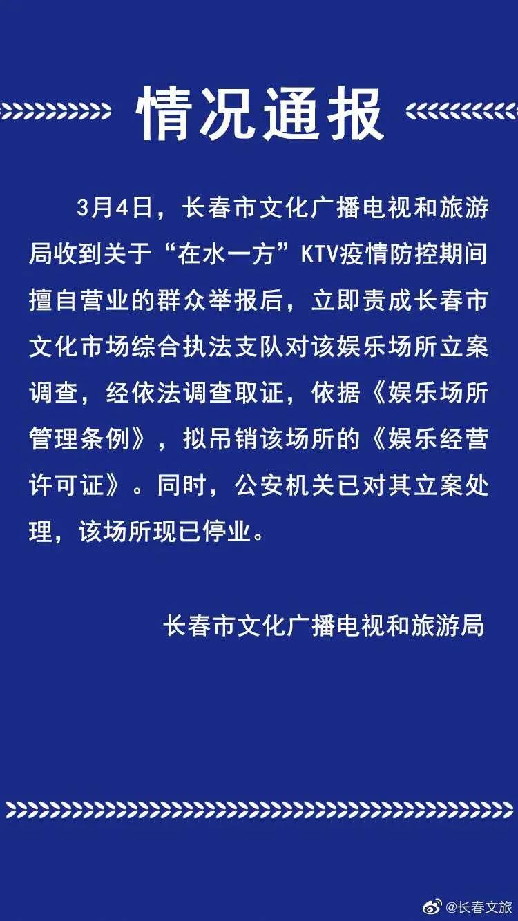 3月4日,长春市文化广播电视和旅游局收到关于“在水一方”KTV疫情防控期间擅自营业的群众举报后,立即责成长春市文化市场综合执法支队对该娱乐场所立案调查,经依法调查取证,依据《娱乐场所管理条例》,拟吊销该场所的《娱乐经营许可证》。同时,公安机关已对其立案处理,该场所现已停业。
