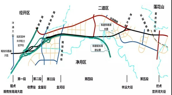 主要建设内容包括道路工程、桥梁工程、隧道工程、排水工程、水利工程、交通工程、绿化工程、电气工程等。其中,新建道路504487平米,新建桥梁33900平米,新建跨铁路桥梁3425.2平米,新建隧道7604.5平米,新建框构桥2200平米,新建U型槽7899.8平米,新建雨污水管线31587.3米,新建绿化:162639平米,新建泵站1处,河道综合整治:643米。其中新建市政桥梁长555米,新建铁路桥梁63米,新建高速桥梁178米,新建隧道长340米。工程建设包含三条道路:新建东南湖大路(洋浦大街-林溪大街),长吉南线(林溪大街-雾开河大街)拓宽改造,新建金宝街(长吉南线-规划金茂街)。