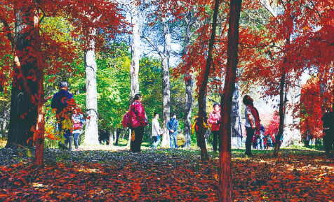 黄绿相间的桦树叶、黄灿灿的山杏叶、火红的枫叶……24日,记者在友谊公园里看到,煦暖的阳光下,地面上的树叶五彩斑斓,煞是好看。“除了园路、广场和木栈道区域‘随落随扫’外,林间落叶都不扫,保洁员只是捡捡垃圾,保持落叶景观。”友谊公园负责人刘永臣对记者说,该园占地面积为30.85公顷,其中绿化面积达18.1公顷,共种植各类植物89种,不仅有白桦、五角枫、白牛槭等长白山秋色叶树种,还有金叶榆、红叶李、紫叶女贞等彩叶树种,“每年一到10月,园内景色特别好看。