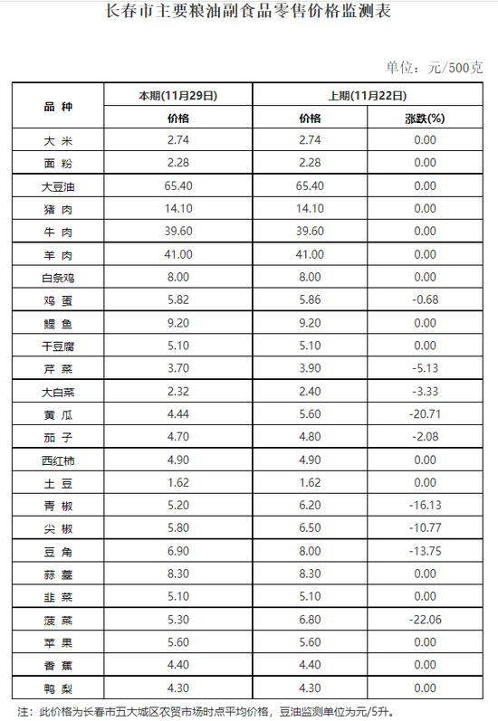 据监测数据显示,长春市重要生活必需品市场货源储备充足、流通渠道畅通,完全可以满足市民的消费需求。与上周一(11月22日)相比,11月29日粮油、副食品和水果价格基本保持稳定,蔬菜价格以降为主。