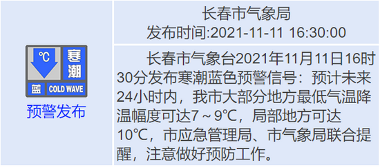 长春市气象台2021年11月11日16时30分发布寒潮蓝色预警信号:预计未来2小时内,长春市大部分地区最低气温降温幅度可达7℃-9℃,局部地方可达10℃,长春市应急管理局、长春市气象局联合提醒,注意做好预防工作。