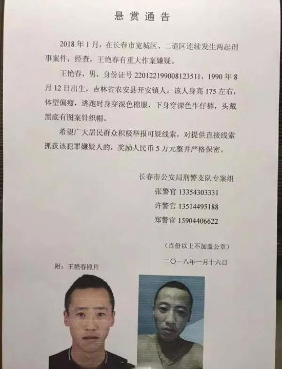 2018年1月在长春市宽城区、二道区连续发生两起刑事案件,经查,王艳春有重大作案嫌疑。