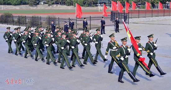 8时50分,国旗护卫队队员擎着鲜艳的五星红旗,喊着铿锵嘹亮的口号,迈着整齐划一的步子,铿锵有力地向国旗台庄严走去。
