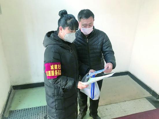 陈淑华向居民宣传防疫知识。林桂清 摄“陈大姐,您放心,我们肯定好好在家隔离,谁都不让来。” “还需要什么生活物资就吱声啊,我帮你们采购。”4日一早,城建小区14栋某单元楼道里响起了陈大姐的大嗓门,大家一听就知道是陈大姐又给居家隔离的居民送菜来了。
