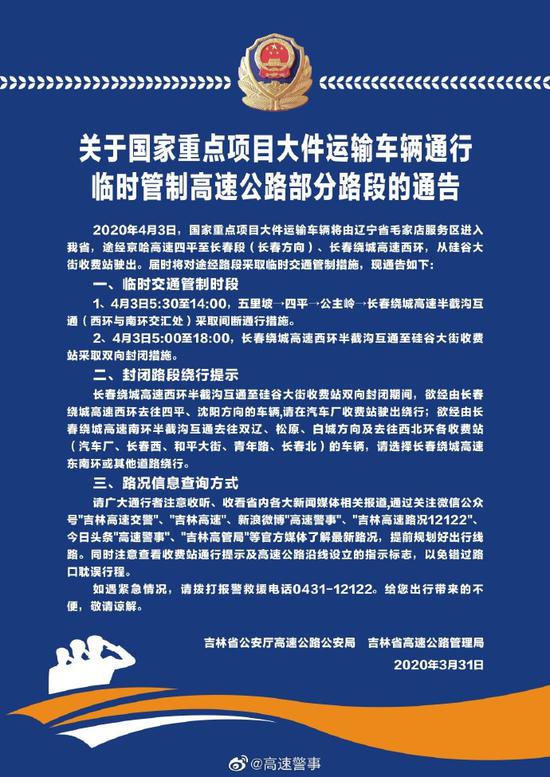 2020年4月3日,国家重点项目大件运输车辆将由辽宁省毛家店服务区进入吉林省,途经京哈高速四平至长春段(长春方向)、长春绕城高速西环,从硅谷大街收站驶出。届时将对途经路段釆取临时交通管制措施,现通告如下: