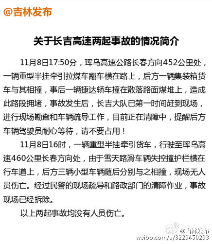 @吉林发布 [长吉高速两起事故 无人员伤亡]#辟谣#8日17:50分和16时,在珲乌高速公路长春方向452公里处和珲乌高速460公里长春方向处分别发生两起交通事故。高速交警第一时间赶赴现场清障,两起事故均无人员伤亡。详情请戳长微。雪天路滑,小布再次提醒司机朋友一定小心慢行,注意安全。
