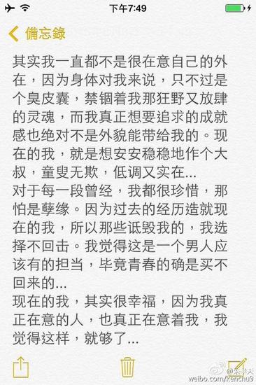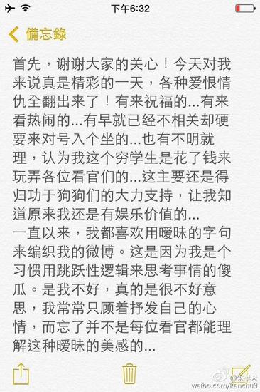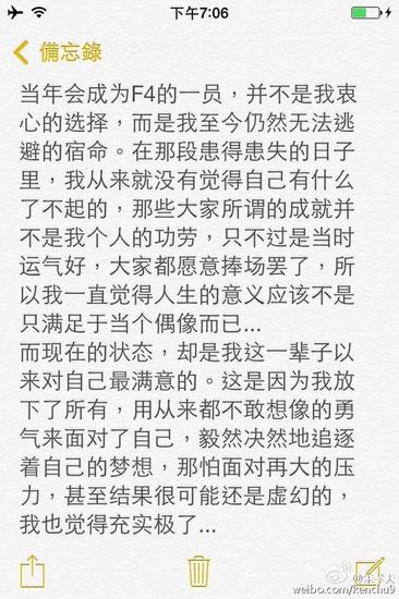 6月3日20点27分,朱孝天发表长微博,疑似对近日的恋情表示默认。他在微博中首先感谢大家对他的关心,谈到当年的F4时,称不是他自己的选择,是无法逃避的宿命。对于现在的状态,却是这一辈子以来最满意的,放下所有追逐自己的梦想,非常的充实。并默认恋情,称:“现在的我,其实很幸福,因为我真正在意的人,也真正在意着我,我觉得这样,就够了……”