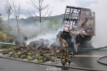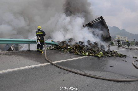 贵州一货车冲出护栏起火 32吨香蕉被烤熟(图)